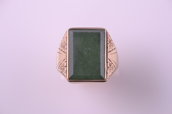 A magnificent bold ring in 18ct yellow gold. The ring is engraved on each side of a rectangular green stone.