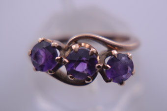 A good-looking ring! 3 sparkling amethysts in royal colour. Set in 9ct rose gold. Circa mid 1940s.