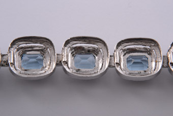 A shiny bling bracelet from the 1950's. Silver set with 10 faux aquamarine stones.