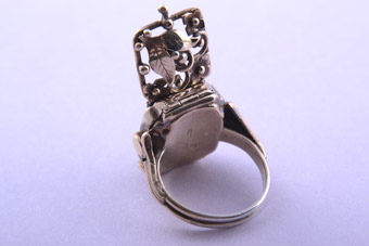 An unusual ring in silver gilt. A cover worked in a floral design, reveals a working watch signed "Felsus".