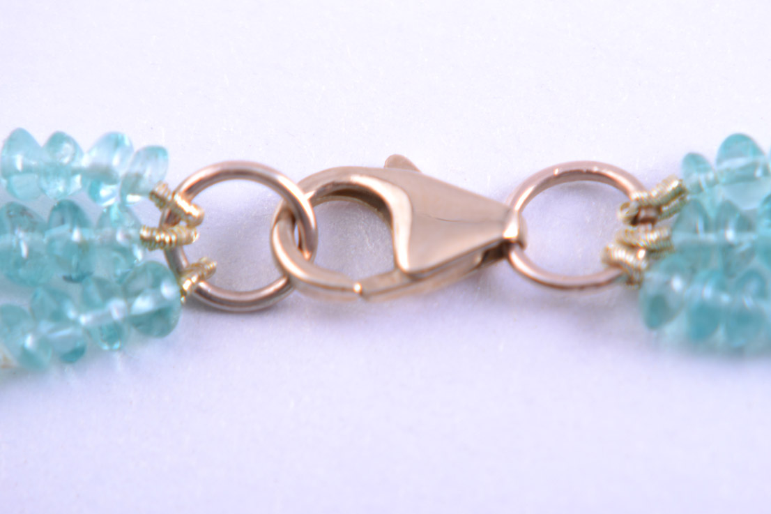 A pretty necklace made up of 3 strands of apatite with a 9ct yellow gold clasp.