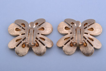 A super pair of large flower clip on earrings signed "Trifari". The frosted gilt finish is set with red diamanté.