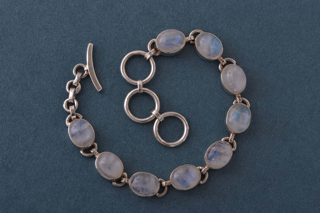 A modern silver bracelet set with 9 cabochon cut moonstones (10.3mm x 7.8mm x 5.75mm) that have pretty luminescent colouring. Marked: ''925''.