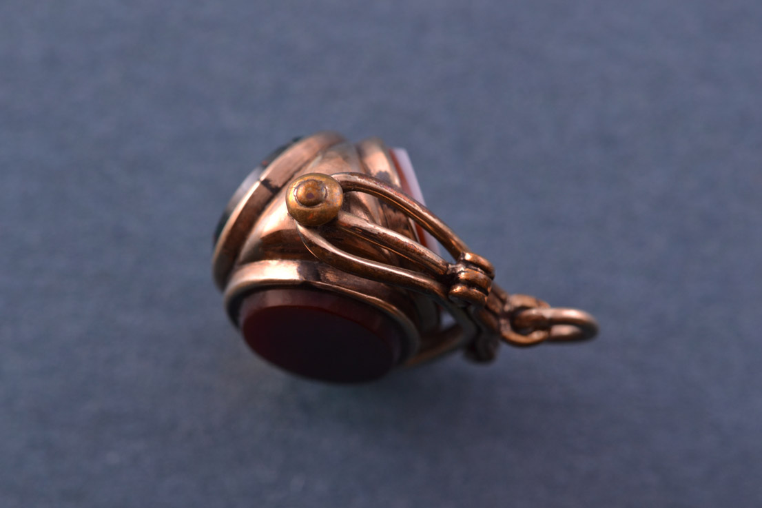 An unusual 3-sided Victorian swivel in 9ct rose gold with agate, bloodstone and carnelian.