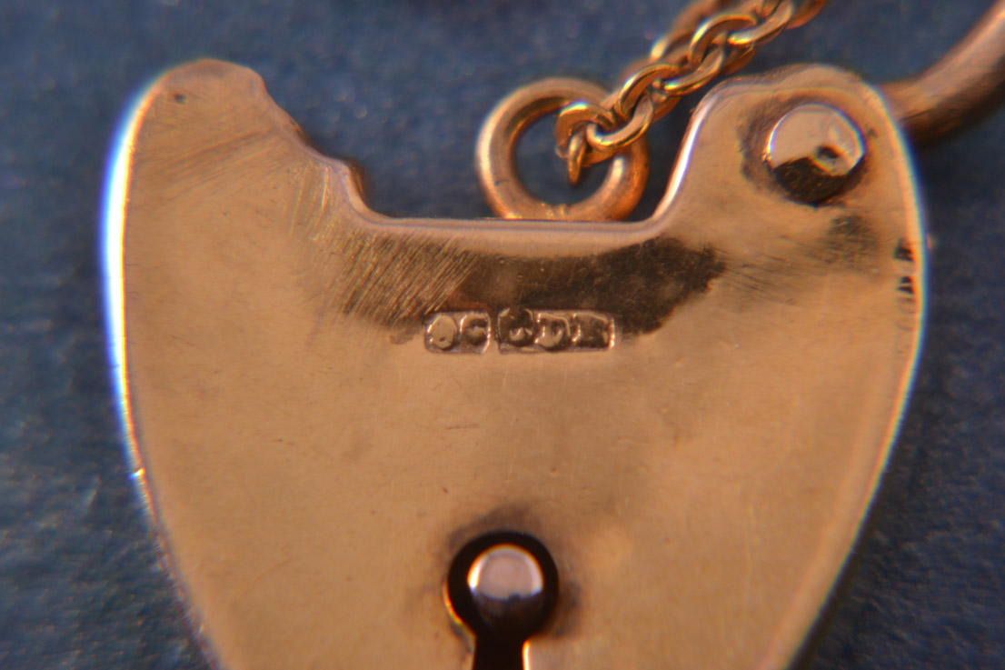 A typical Victorian gate bracelet in 9ct yellow gold with a safety chain and heart-shaped padlock. Marked: ''9c''.